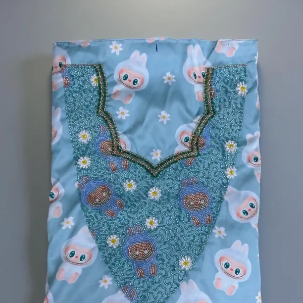 دلّلي صغيرتك بلمسة سحرية مع هذا القماش المصنوع من الحرير الإيطالي الفاخر، والمزيّن برسومات ديزني المرحة. ناعم وأنيق مع تطريزات لؤلؤية وألوان حالمة، مثالي لعمر 3 إلى 12 سنة.
