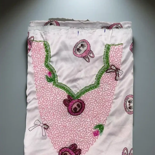 دلّلي صغيرتك بلمسة سحرية مع هذا القماش المصنوع من الحرير الإيطالي الفاخر، والمزيّن برسومات ديزني المرحة. ناعم وأنيق مع تطريزات لؤلؤية وألوان حالمة، مثالي لعمر 3 إلى 12 سنة.