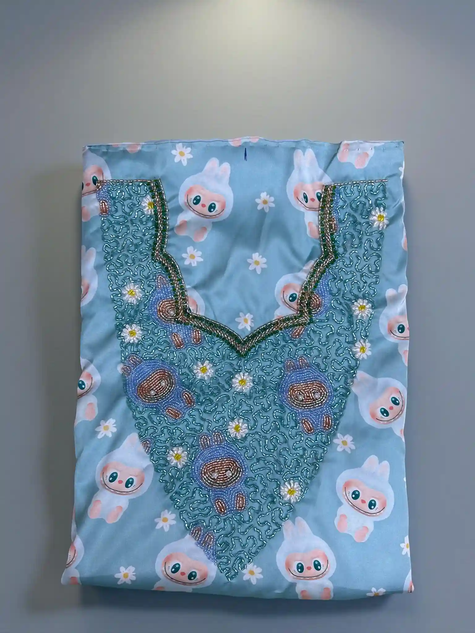 دلّلي صغيرتك بلمسة سحرية مع هذا القماش المصنوع من الحرير الإيطالي الفاخر، والمزيّن برسومات لابوبو المرحة. ناعم وأنيق مع تطريزات لؤلؤية وألوان حالمة، مثالي لعمر 3 إلى 12 سنة.